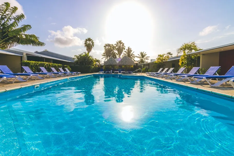 Basic maar ruime appartementen mét een terras. Hier drink je 's ochtends een koffie in de zon. De gratis shuttleservice neemt je mee naar het strand of Oranjestad. Of blijf rondom het zwembad voor wat verkoeling.