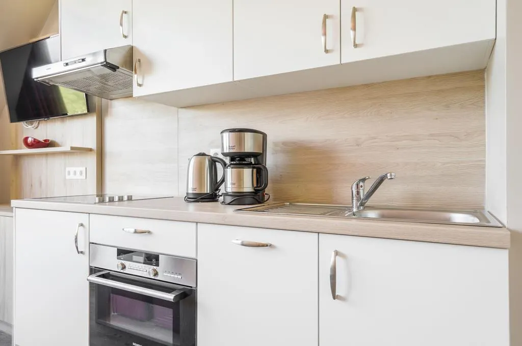 keuken met oven, magnetron, elektrische kookplaat, vaatwasser, koelkast, koffiezetapparaat en waterkoker