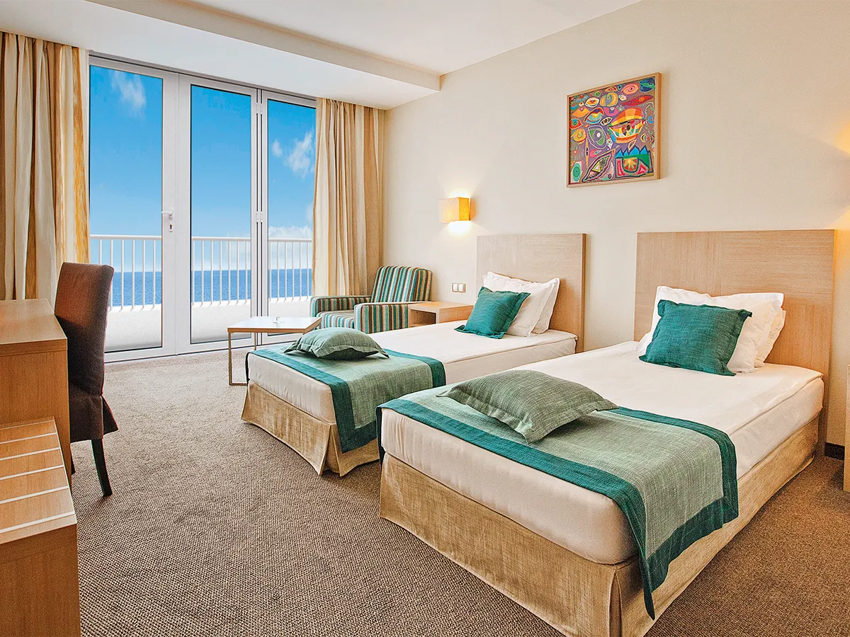 - Tweepersoonskamer (DZ, ca. 25 m²), airconditioning, minikoelkast, telefoon, tv, WiFi (tegen betaling). Bad, toilet, haardroger. Balkon met zeezicht. Max. 2V+1K/3V