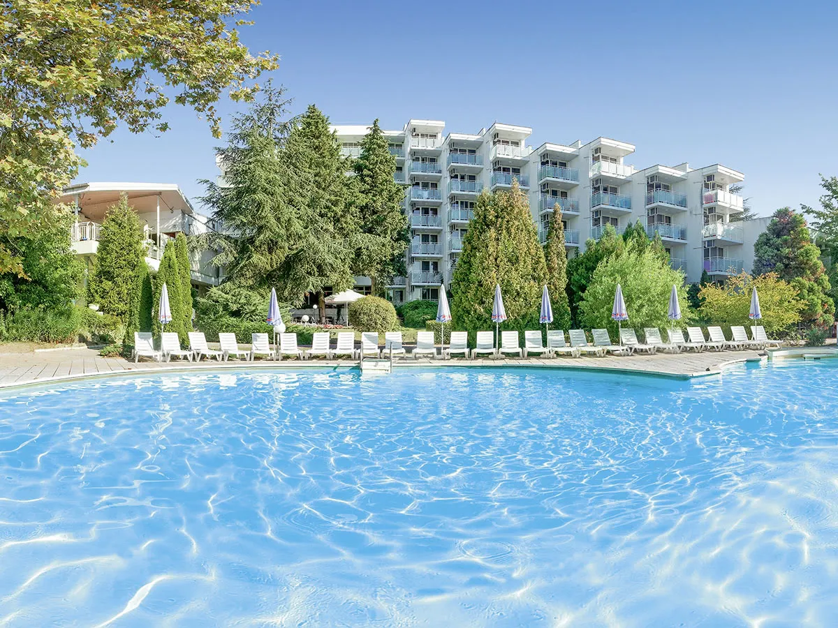 - Geliefd familieresort met ruime tuin. Zwembad, zonneterras, gazon. 2 ligbedden, parasol, badhanddoeken (tegen borg), bij het zwembad en op het strand vanaf de 3e strandrij incl., 1e en 2e rij tegen betaling, poolbar. Hotellobby met receptie, huurkluizen, WiFi, restaurant met terras, lobbybar, amfitheater. 4 sterren, 163 kamers, 4-7 verdiepingen, 3 liften.