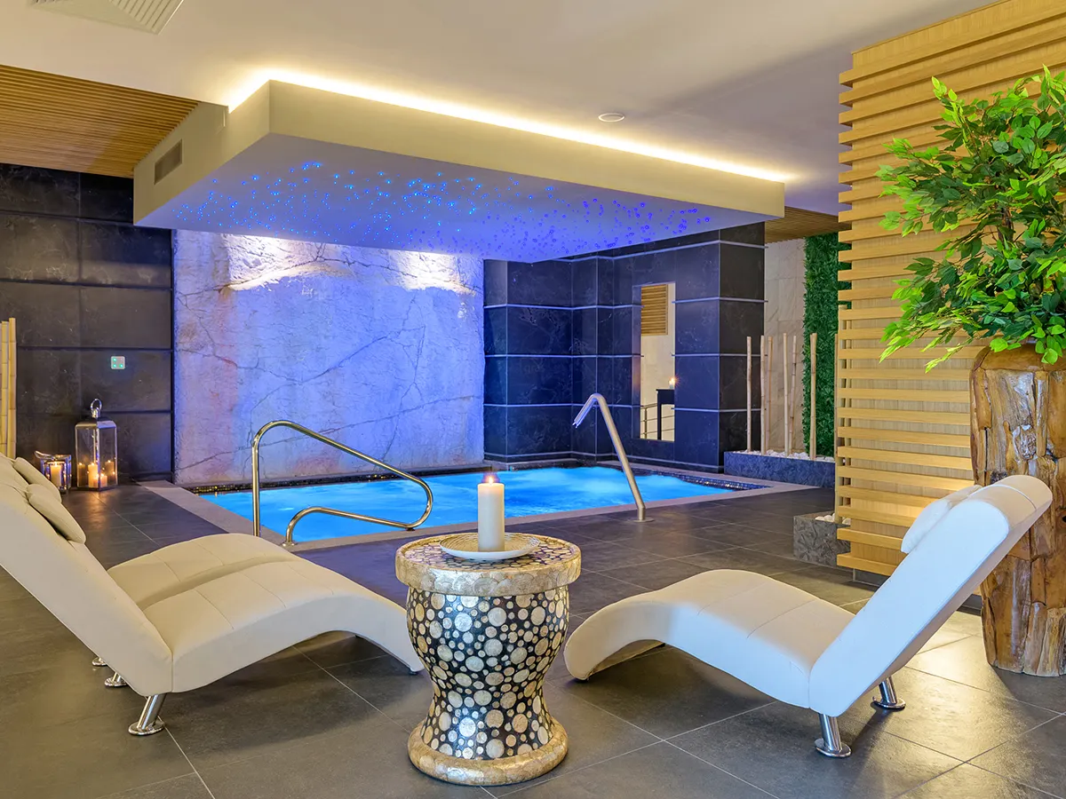 - Wellnessruimte (ca. 1.800 m²) met sauna, stoombad en whirlpool, badjas
