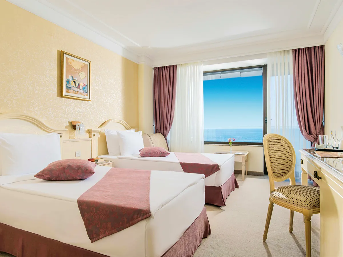 - Tweepersoonskamer-deluxe (DDM, ca. 47 m²), airconditioning, minibar (tegen betaling), telefoon, WiFi, tv. Bad, toilet, haardroger. Balkon met zeezicht. Max. 3V/2V+2K