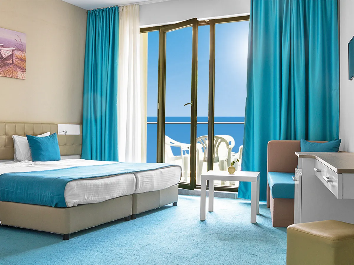 - Familiekamer (FA, ca. 27 m²), airconditioning, minibar (tegen betaling), tv, WiFi, huurkluis. Douche, toilet, haardroger. Balkon. Min/Max. 2V+1K