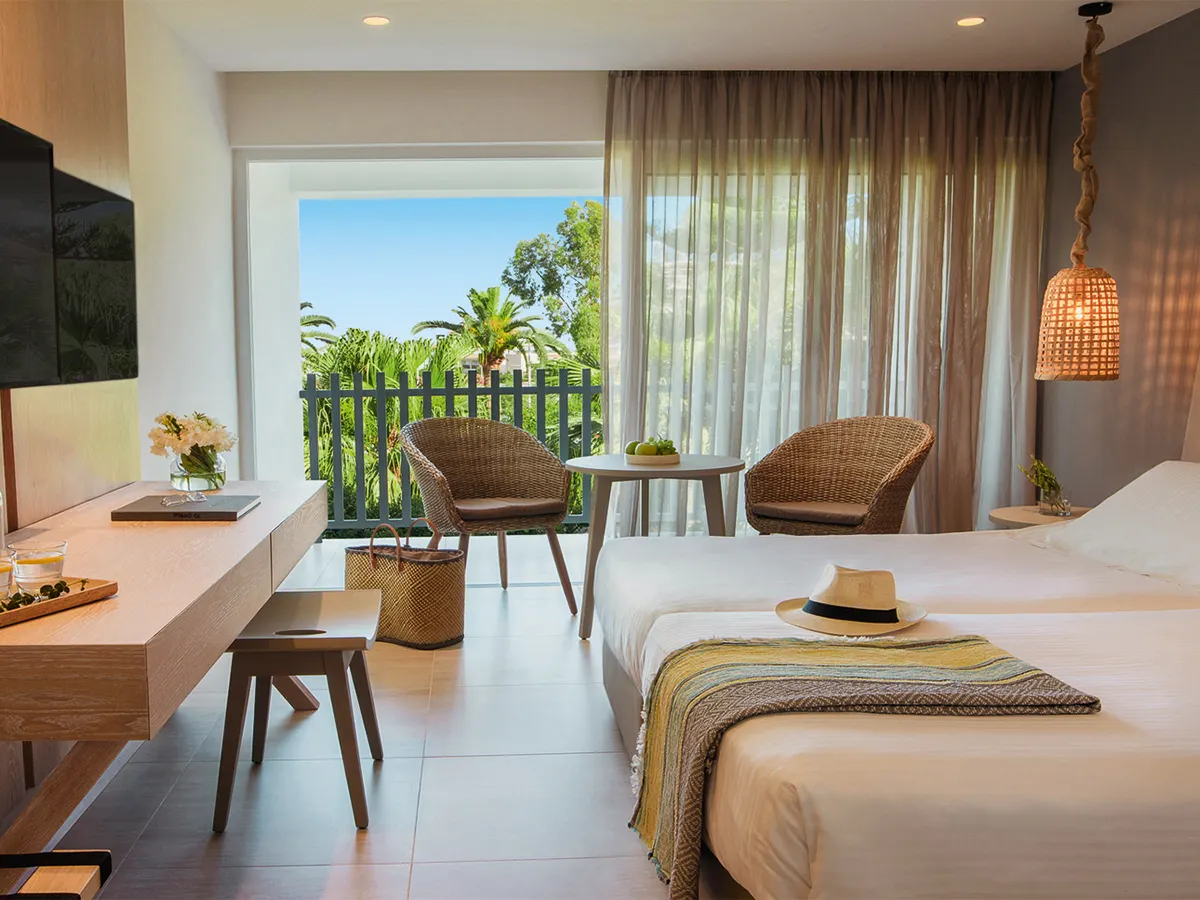 - Tweepersoonskamer (DZ, ca. 22 m²), airconditioning (w./k.), minikoelkast, koffie-/theezetapparaat, WiFi, tv, telefoon, kluis. Bad, toilet, haardroger. Balkon/terras. Tuinzicht. Max. 3V<br>Tweepersoonskamer (DZM, ca. 22 m²), airconditioning (w./k.), minikoelkast, koffie-/theezetapparaat, WiFi, tv, telefoon, kluis. Bad, toilet, haardroger. Balkon/terras. Zeezicht. Max. 3V<br>Elk voor alleengebruik (DEZ, DEM)<br>Suites (SU, ca. 35 m²), airconditioning (w./k.), minikoelkast, koffie-/theezetapparaat, espressomachine, WiFi, tv, telefoon, kluis. Douche, toilet, badjassen, slippers, haardroger. Balkon/terras, zeezicht. Max. 4V