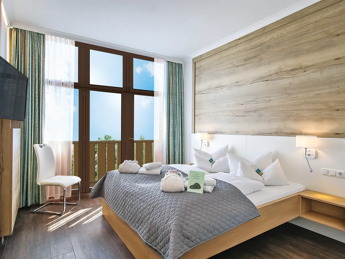- Tweepersoonskamer (DZ3, ca. 44 m²), woonkamer, 1 ap. slaapkamer met tweepersoonsbed, tv, WiFi (inclusief), minibar (teg. bet.), zithoek. Balkon/terras.