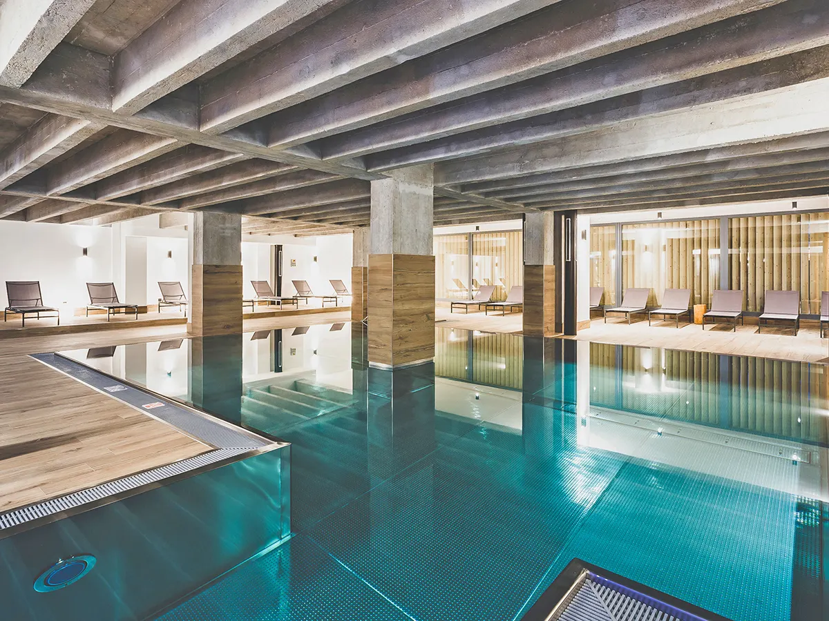 - Wellnessruimte (ca. 750 qm) met binnenzwembad met massagestraal en aangesloten, verwarmbaar buitenzwembad, saunagedeelte met sauna, sanarium, stoombad, evenals een ontspanningsruimte binnen en buiten.