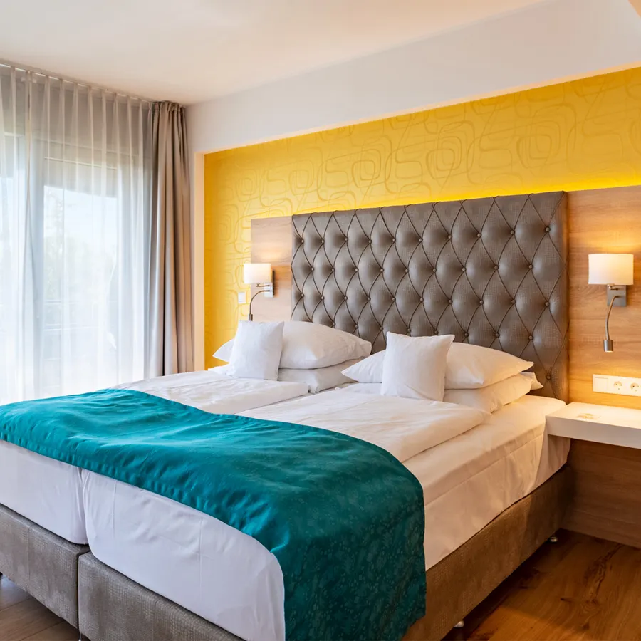 - Deluxe kamer (DZC, ca. 38 m²), optisch gescheiden woon- en slaapgedeelte, tv, WiFi (inclusief), kluis, bureau, zitje. Bad/douche, toilet, haardroger. Max. 3V