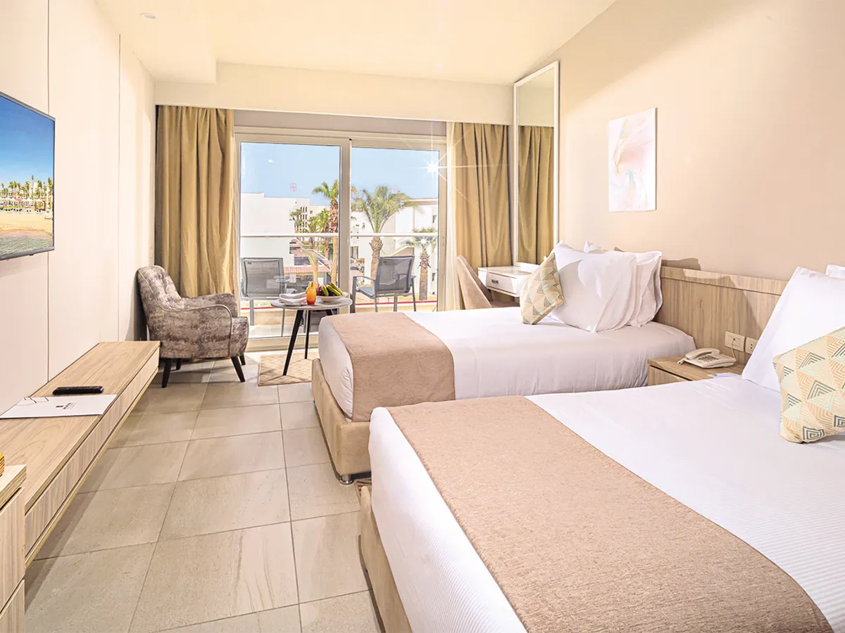 - Tweepersoonskamer (DZ, ca. 30-35 m²), airconditioning, kluis, flatscreen-tv, minibar, telefoon, thee- en koffiezetapparaat, WiFi. Douche, toilet, haardroger. Balkon of terras met tuinzicht, naar keuze zwembadzicht (DZP)/zeezicht (DZM). Max. 3V, te boeken voor alleengebruik (EZ)<br>Superior-kamer (DSP, ca. 35-40 m²), airconditioning, kluis, flatscreen-tv, minibar, telefoon, thee- en koffiezetapparaat, WiFi. Douche, toilet, haardroger. Balkon of terras met tuinzicht, naar keuze zwembadzicht (DP). Max. 3V+1K<br>Deluxe-kamer (DJM, ca. 36-42 m²), airconditioning, kluis, flatscreen-tv, telefoon, thee- en koffiezetapparaat, WiFi. Bad, toilet, haardroger. Balkon of terras met zeezicht. Max. 3V+1K<br>Familiekamer (FZ, ca. 32-36 m²), aparte slaapkamer, 2 slaapbanken voor 3e en 4e persoon, airconditioning, kluis, flatscreen-tv, minibar, telefoon, thee- en koffiezetapparaat, WiFi. Douche, toilet, haardroger. Balkon of terras met tuin. Max. 4V