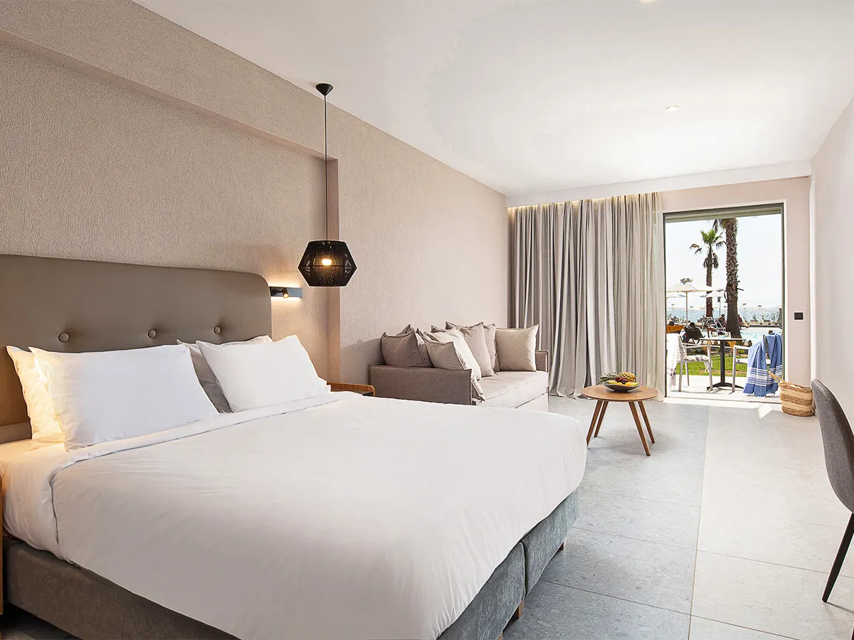 - Superior-tweepersoonskamer (DMS, ca. 30 m²), airconditioning, minibar, koffie-/theezetapparaat, wifi, tv, telefoon, kluis. Douche, toilet, haardroger. Balkon of terras. Zijdelings zeezicht. Naar keuze met direct zeezicht (DSF) of met terras en sharingpool (DSP) te boeken. Max. 2V+1K<br>DMS naar keuze voor alleengebruik (EMS)