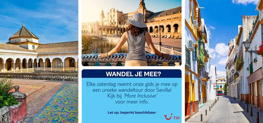 Wie op zaterdag met TUI in Sevilla is, krijgt een unieke wandeltour door Sevilla. TUI trakteert! De wandeling begint bij het houten bouwwerk Metropol Parasol. Daarna wandelen we langs het 16-eeuwse paleis Casa de Pilatos, kun je heerlijke zoetigheden proeven bij het klooster San Leandro en ontdek je de hippe wijk rondom Calle Feria met veel street art. De gids vertelt je meer over de oudste tapas bar van de stad en over de historie van bijzondere plekken als La Puerta de La Macarena en Alameda de Hercules. Als je je stedentrip naar Sevilla boekt, krijg je bij stap 2 de mogelijkheid om deze stadwandeling te reserveren. Er zijn maar een beperkt aantal plaatsen beschikbaar. Krijg je tijdens het boeken geen optie om de tour te selecteren, dan zit deze helaas vol.