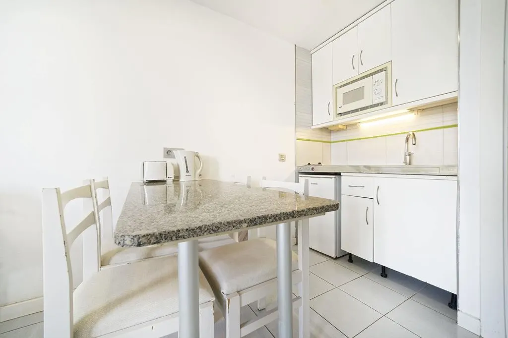 kitchenette met magnetron, keramische kookplaat (2 zones), koelkast, broodrooster, waterkoker en eethoek